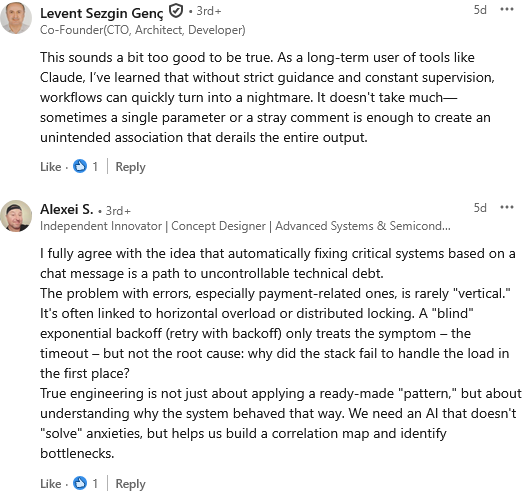 Another commenter took issue with the idea of automatically resolving critical system failures based on conversational input alone, arguing that many real-world errors — particularly in areas like payments — are rarely isolated to a single line of code. Instead, they tend to emerge from broader systemic issues such as load, contention, or distributed coordination, where treating surface symptoms can obscure deeper architectural causes.