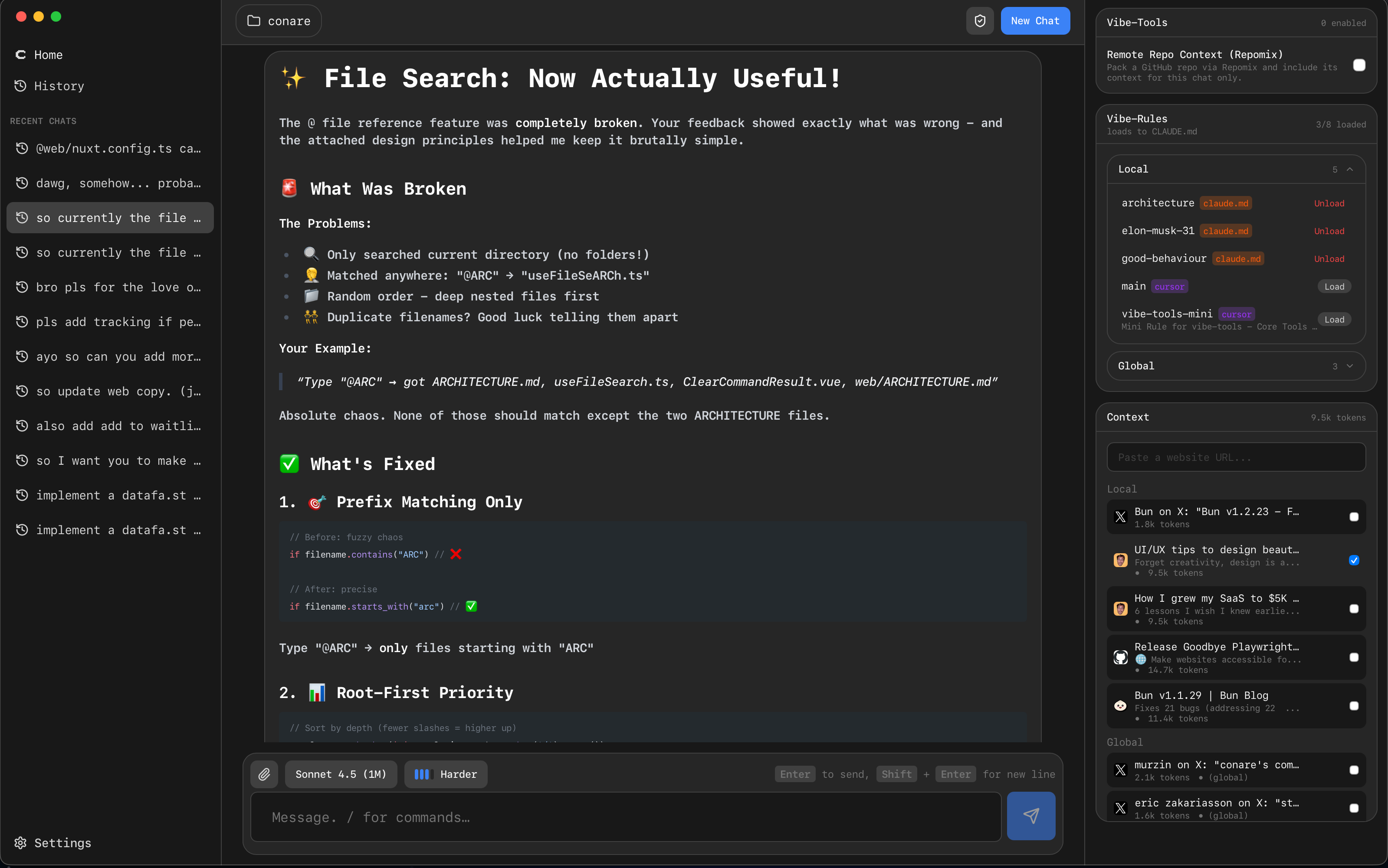 Once you’ve defined a few context items or rules, you’re ready to start chatting. You can ask Claude to write or edit code directly from within Conare, and watch its actions unfold in real time — file reads, writes, and updates are all logged in a sidebar so you can see what the model’s doing as it happens.