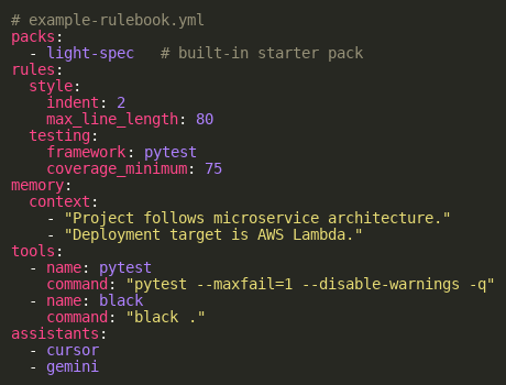 This ruleset might specify a project’s language and style conventions, testing framework, and a few core rules for code quality. Rulebook-AI also supports the idea of Packs, which are prebuilt collections of rules and tools that serve as a starting point. One of the built-in Packs is light-spec, which lays down a lightweight set of defaults. Developers can load light-spec and then extend it with their own project-specific guidance.