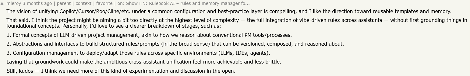 At the same time, they cautioned that the project might be reaching too far, too fast. More specifically, they felt that Rulebook-AI is trying to unify the more free-form, “vibe-driven” style of coding across assistants, before laying the necessary conceptual groundwork and intermediate steps