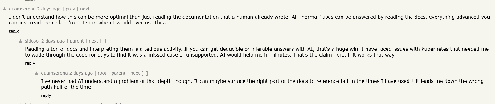 Early community reactions reflect that tension: some see Code Wiki as a genuine shortcut through dense systems, while others wonder if it simply restates what the docs and source already say — shifting the work around rather than reducing it.